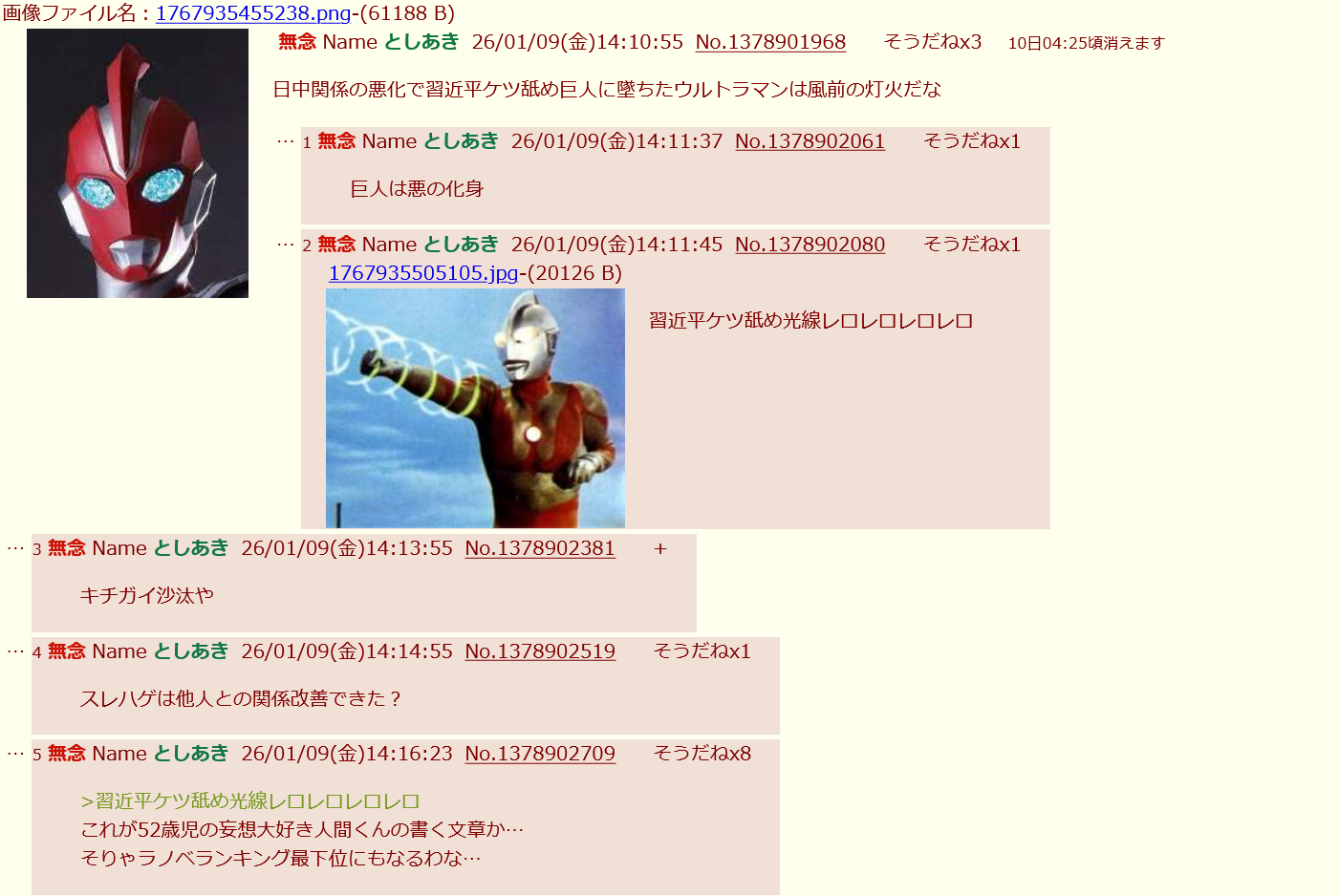 | … | 7無念Nameとしあき26/02/03(火)13:56:32No.1384625646そうだねx1ウルトラ関係ないランクに乗ったからと言って円谷プロ正式の映像に出てない時点で出禁みたいなもんだろ |