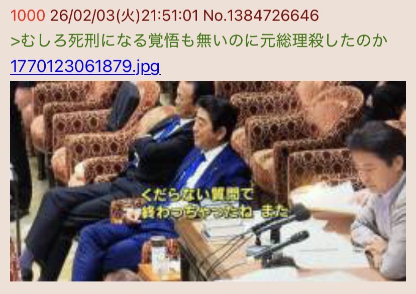 | … | 91無念Nameとしあき26/02/03(火)22:12:52No.1384733066そうだねx1>安部って殺されても仕方がないやつだったことが世間に知れ渡ってよかったね |