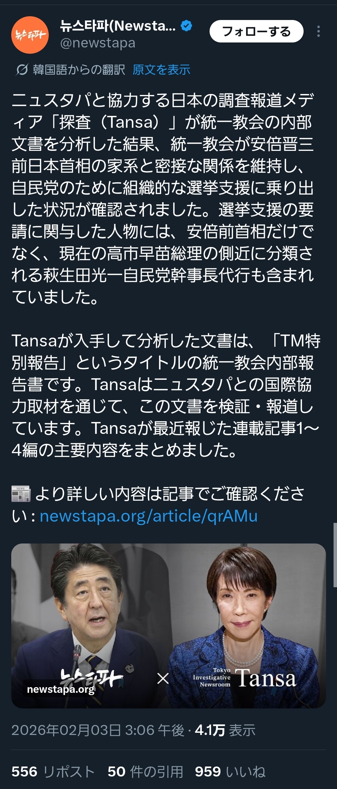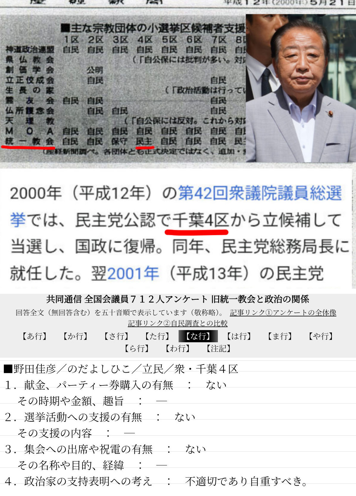 | … | 31無念Nameとしあき26/02/03(火)22:00:01No.1384729357そうだねx13 1770123601333.jpg-(418179 B) 佳勝会なる後援会を作って10年も選挙の応援してもらってた上に統一の教会を訪れてゆけゆけ佳彦!と歌まで歌ってもらってしかも2019年に議員会館で統一幹部と会談してた野田佳彦さんの事を無視して自民だけがズブズブだったという物語を捏造出来そうですか? |