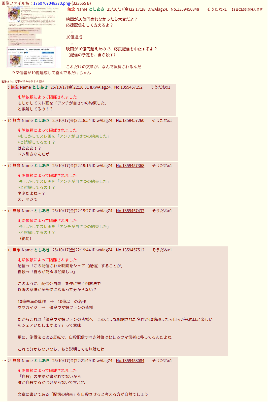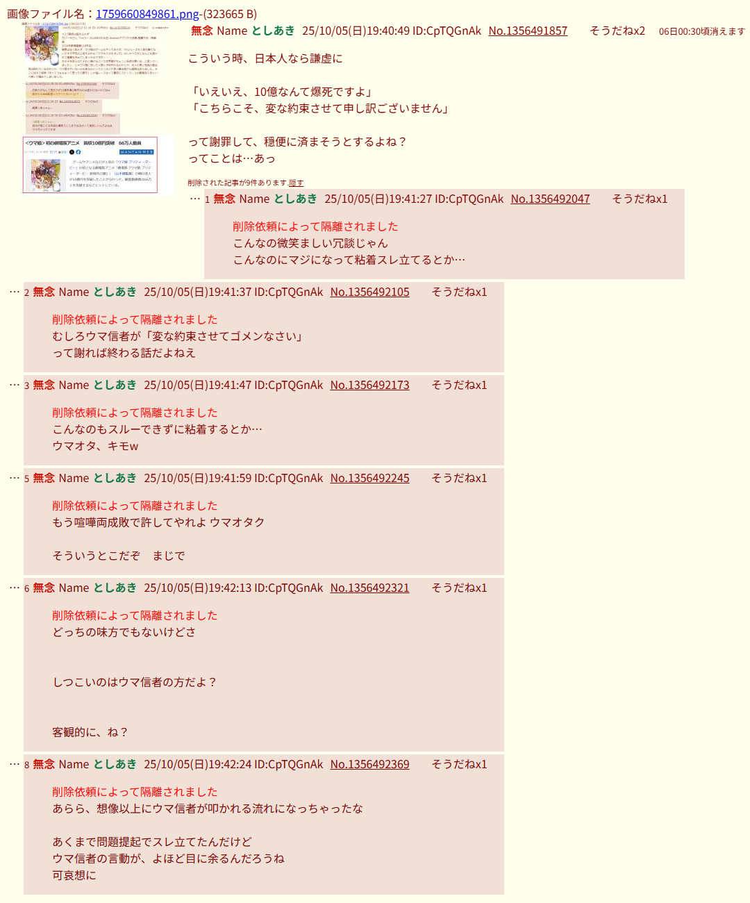 | … | 74無念Nameとしあき26/02/03(火)23:25:05No.1384752500+またいろいろ同じ画像で複数スレ始めてるな |