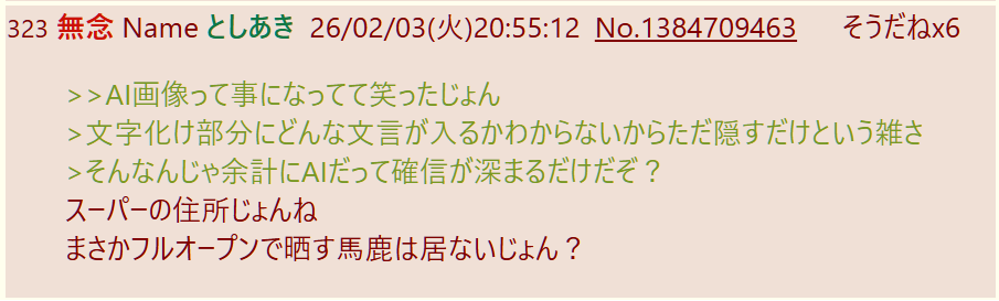 | … | 380無念Nameとしあき26/02/04(水)00:38:41No.1384767918そうだねx4>恵方巻きもAI画像だったということに事実が上書きされてそれを「スレ豚」相手に延々擦るぞ |