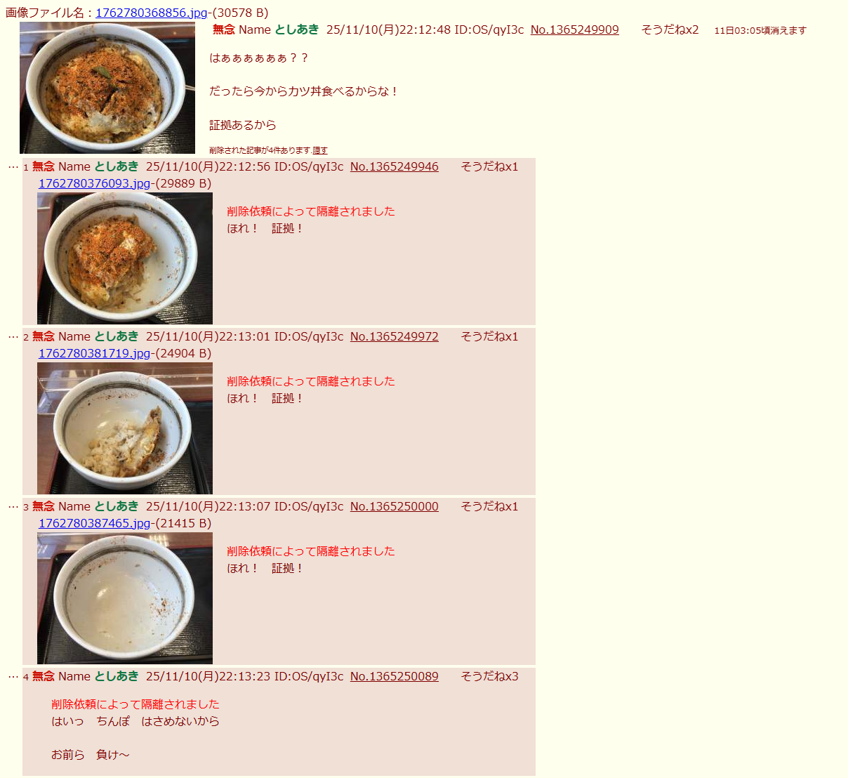 | … | 401無念Nameとしあき26/02/04(水)00:50:49No.1384770090+>食い物に対する執着が異常だな |