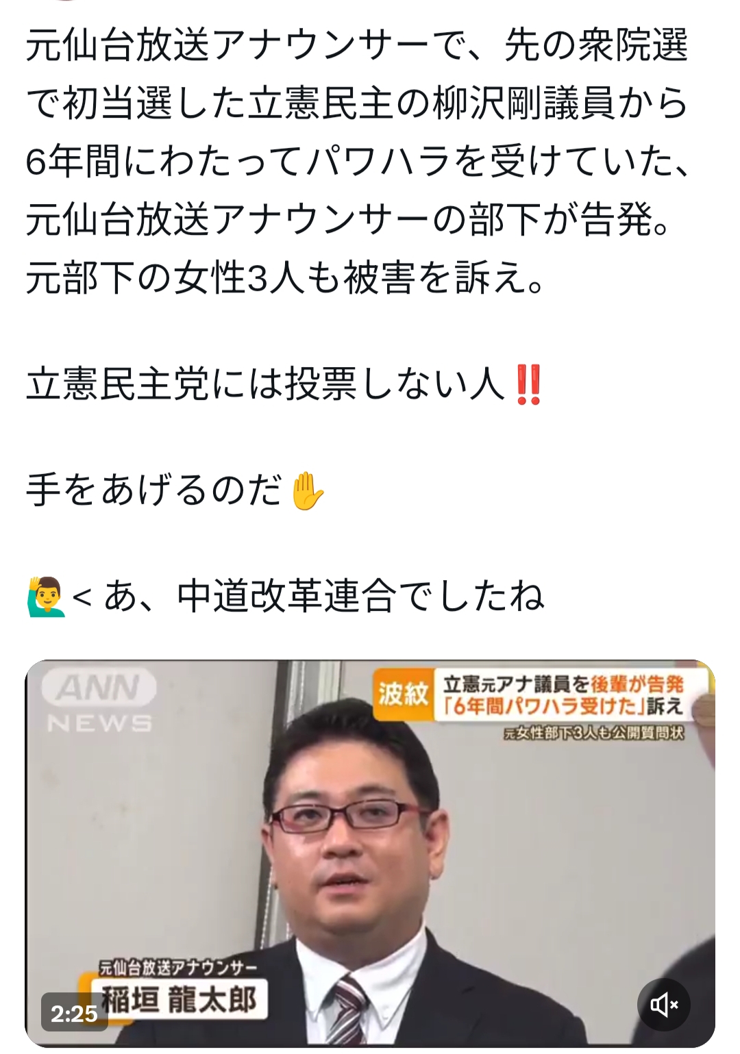 【悲報】中道の柳沢剛議員から6年間にわたってパワハラを受けていた!削除された記事が4件あります.見る