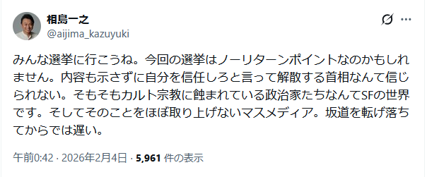| … | 262無念Nameとしあき26/02/04(水)02:16:04No.1384778246そうだねx2>投票用紙が届いたらやばいよ |