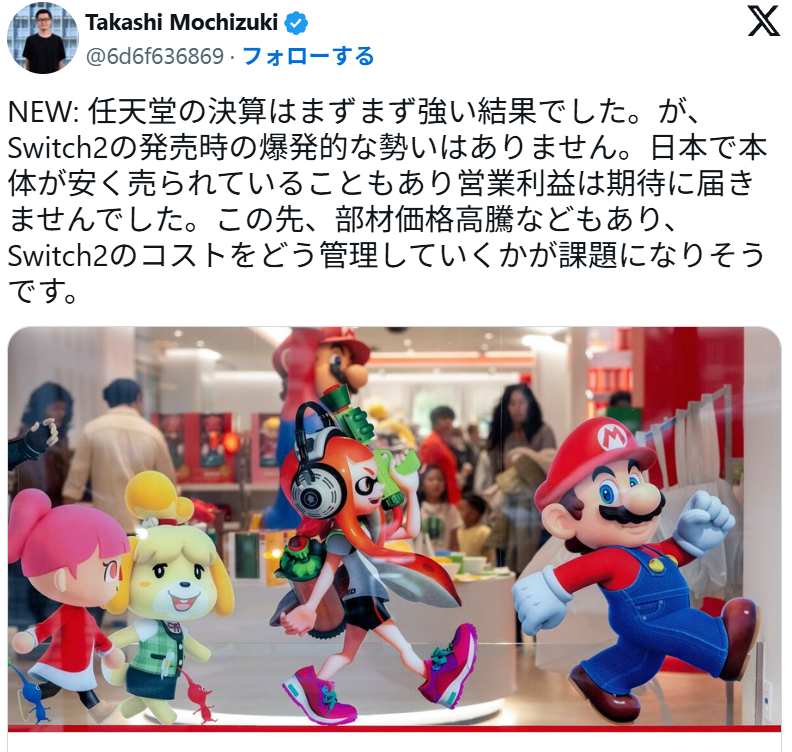 Switch2発売時の爆発的な勢いは無い。営業利益も期待に届かなかった