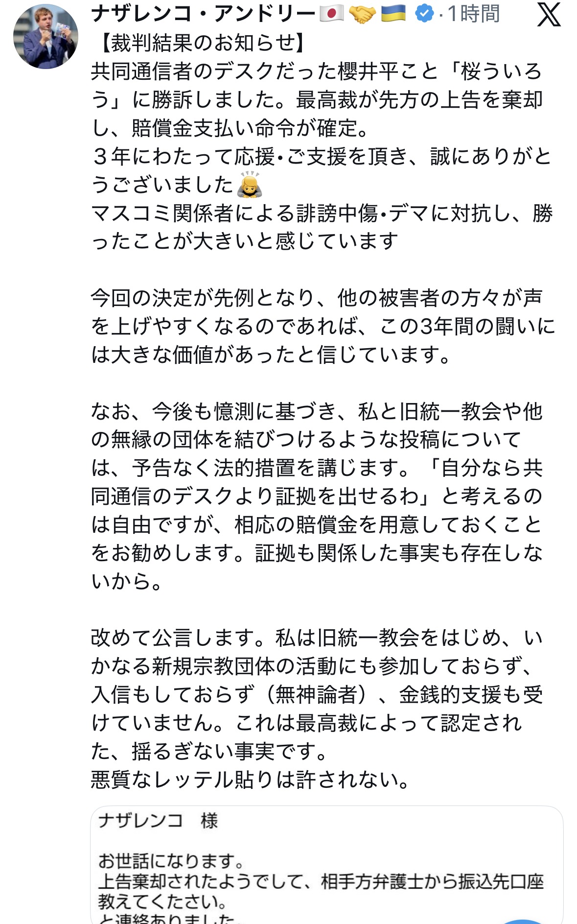 共同通信者のデスクだった櫻井平こと「桜ういろう」に勝訴しました。最高裁が先方の上告を棄却し、賠償金支払い命令が確定。