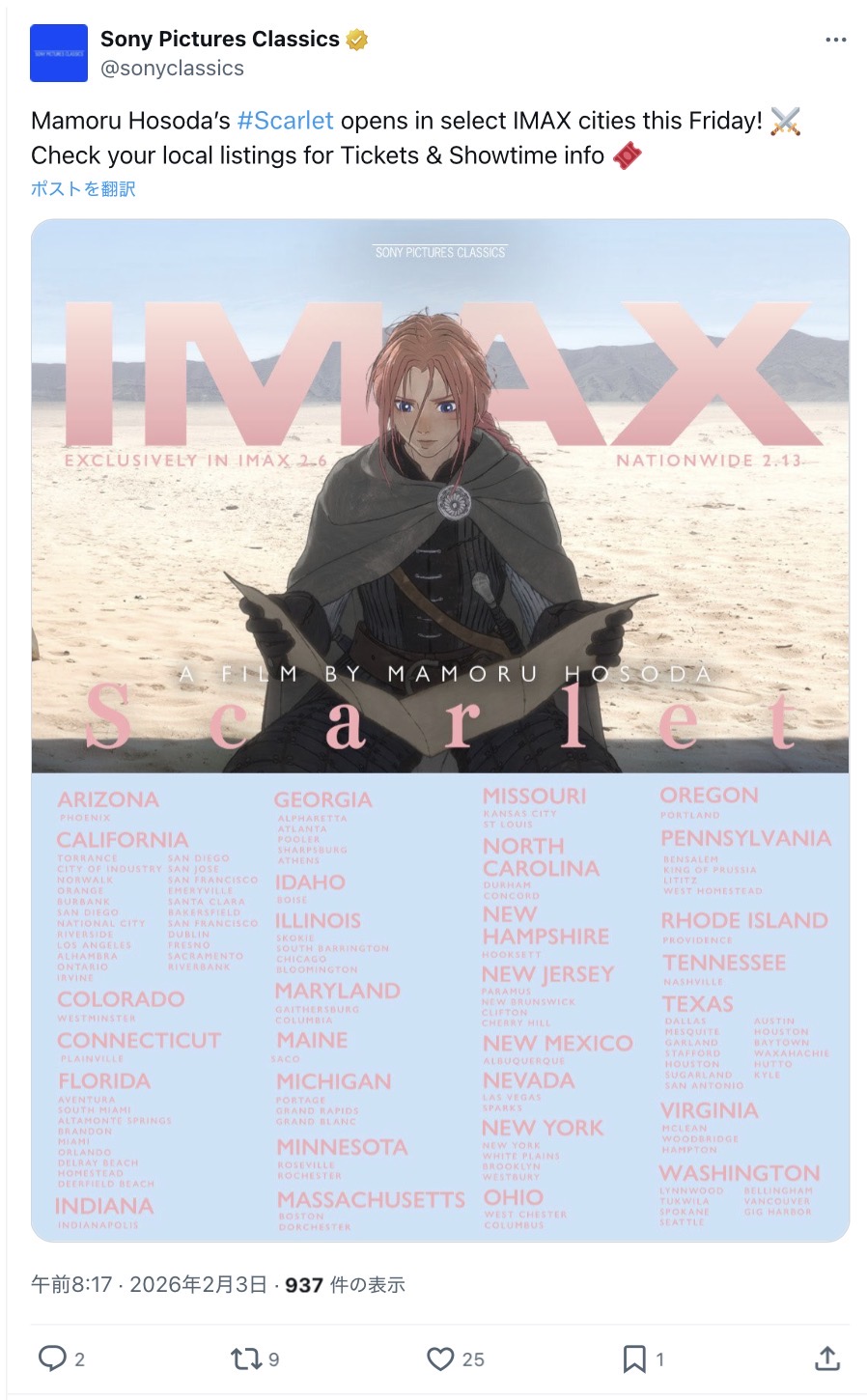 | … | 118無念Nameとしあき26/02/04(水)17:34:12No.1384878898+>アメリカでIMAX上映開始! |
