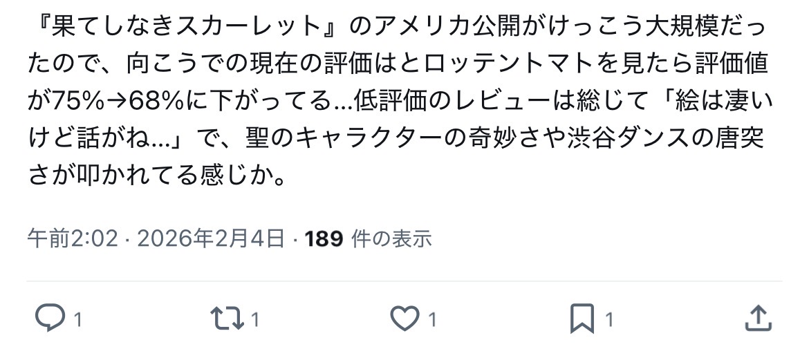 | … | 127無念Nameとしあき26/02/04(水)17:40:40No.1384880028そうだねx2>そもそもスカーレットまだ上映してるところがいくつあるんだ |