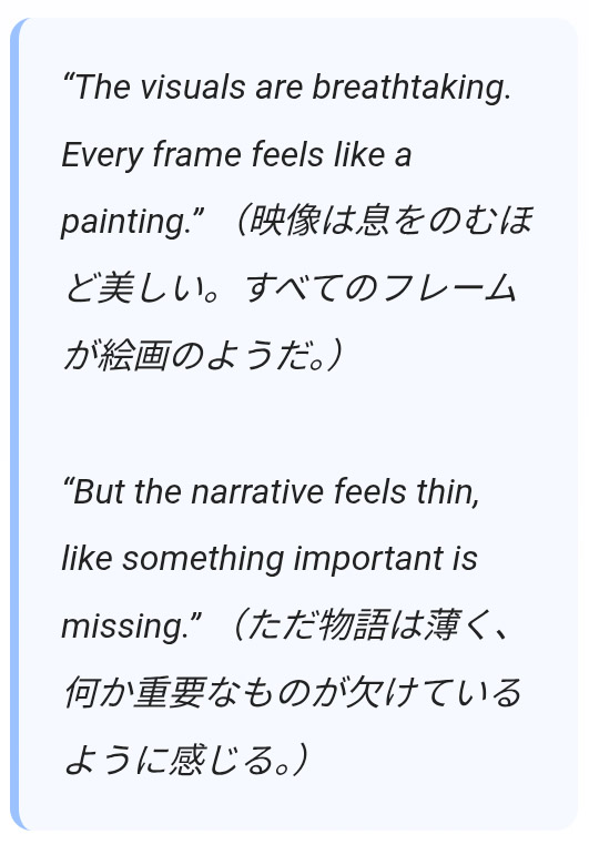 | … | 54無念Nameとしあき26/02/04(水)16:33:39No.1384869107そうだねx3>少なくともアメリカは映像美さえよければストーリーは二の次って人が結構いるからな |