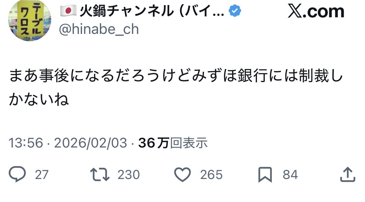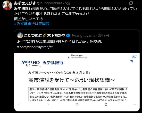 | … | 41無念Nameとしあき26/02/04(水)16:40:21No.1384870214+高市さんを批判したみずほ銀行を許さない |