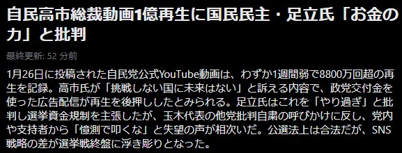 | … | 51無念Nameとしあき26/02/04(水)16:45:14No.1384871044そうだねx2>最初の見出ししか見てないからみんな高市だけを批判してるって思い込んでる |