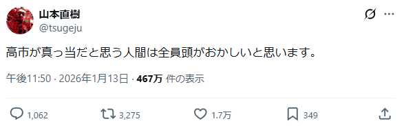 | … | 60無念Nameとしあき26/02/04(水)20:46:02No.1384924894そうだねx1>元BOOWYのドラマー、高市首相の地元を「頭の悪い奈良の民」名指しで “口撃” |
