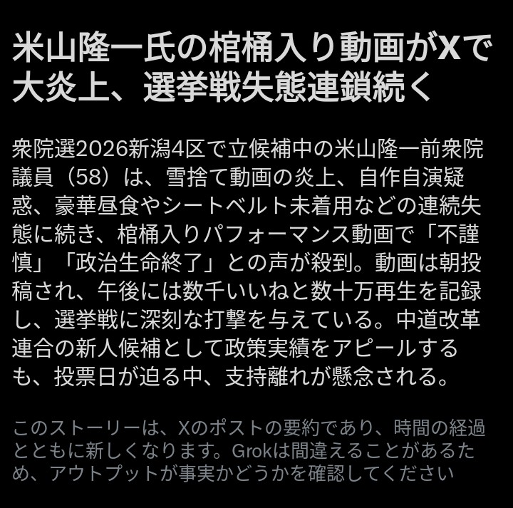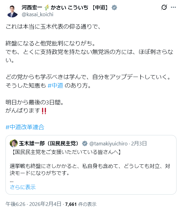 | … | 912無念Nameとしあき26/02/04(水)21:58:09No.1384946605そうだねx1>合併したために変節を強いられた立憲候補者かわいそう… |