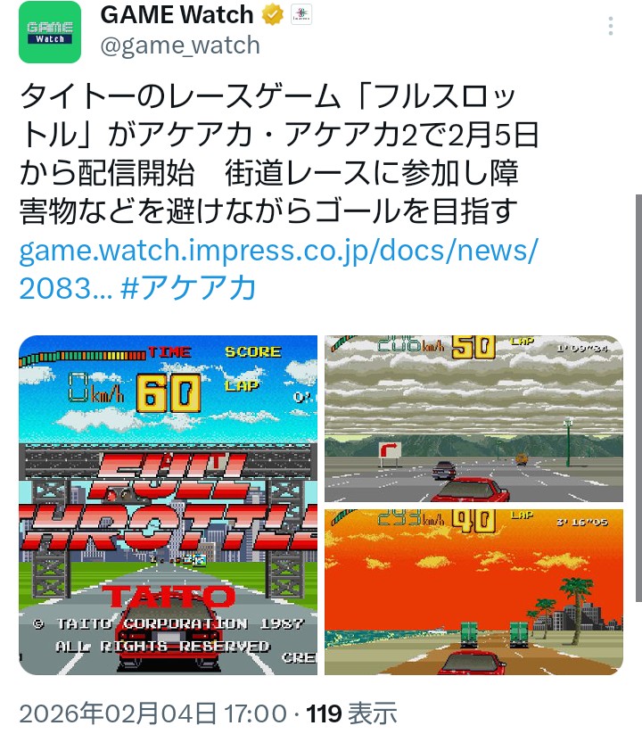 | … | 28無念Nameとしあき26/02/05(木)00:06:01No.1384979635そうだねx1 1770217561504.jpg-(384187 B) >今週は「フルスロットル」タイトー |