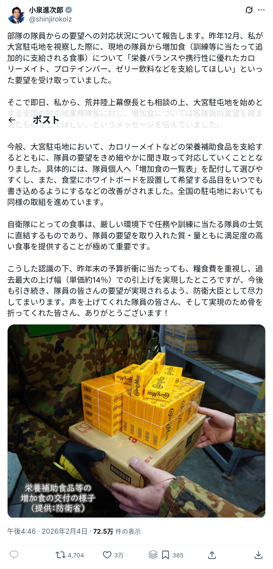 | … | 51無念Nameとしあき26/02/05(木)11:59:55No.1385038131+>小泉防衛大臣の尽力により自衛隊にカロリーメイトが配給された |