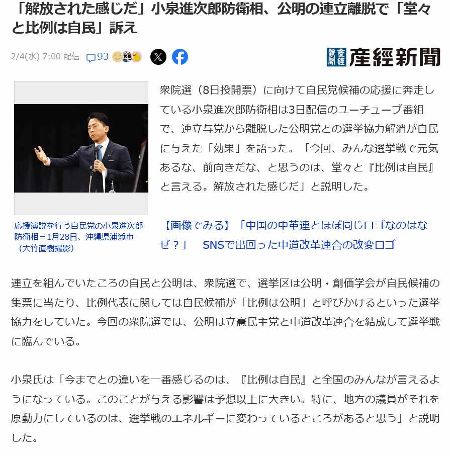 | … | 72無念Nameとしあき26/02/05(木)12:23:21No.1385042433+ 1770261801634.jpg-(102893 B) 小泉防衛大臣「比例は公明」と言わなくなって「解放された感じ」 |