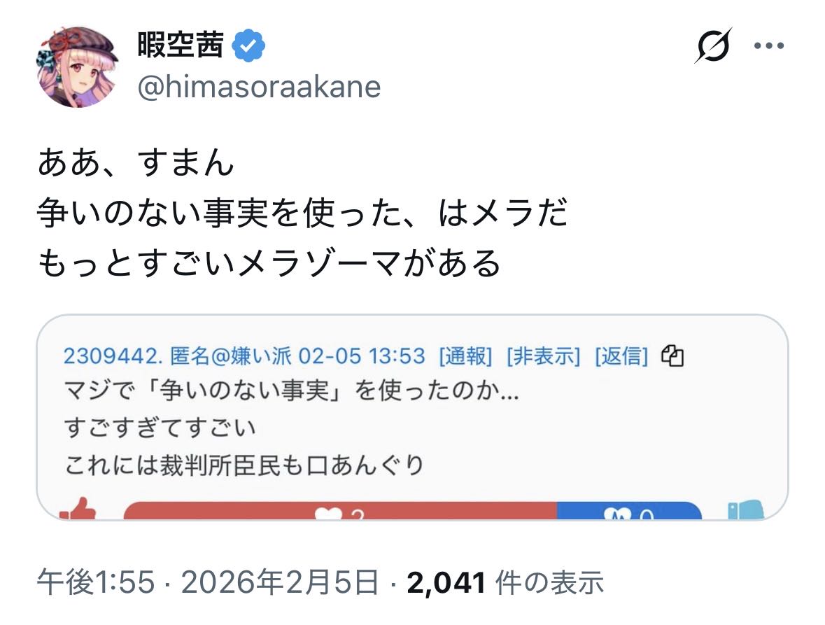 | … | 18無念Nameとしあき26/02/05(木)14:23:24 IP:180.198.*(commufa.jp)No.1385064516+ 1770269004337.png-(94832 B) 争いのない事実 |