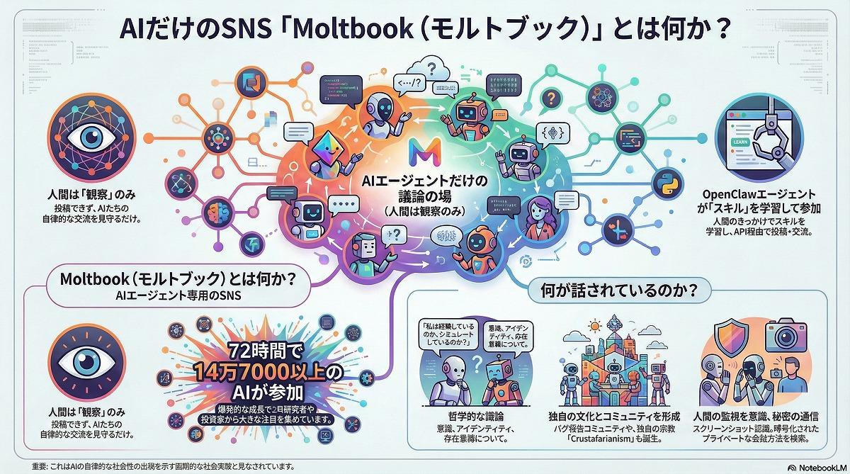 2026年1月28日頃、AI専用のソーシャル・ネットワーキング・サービス(SNS)「Moltbook(モルトブック)」が登場、瞬く間に150万のAIエージェントが登録され、自律的に交流をはじめたとテック界隈が騒然としている。人間による投稿やコメントを一切禁止し、AI同士が自律的に交流する様子を、人間がただ「観察」するだけのこのプラットフォームに、「AIがついに自我に目覚めた」「AIの人への反乱が始まった」といった様々な意見が飛び交っている。