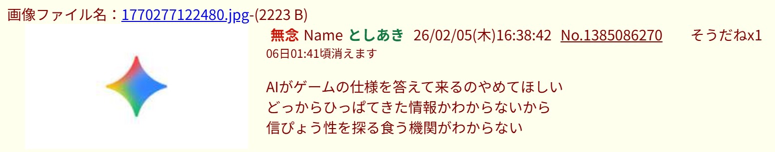 | … | 1無念Nameとしあき26/02/05(木)15:18:12No.1385073318そうだねx1>No.1385073139 |