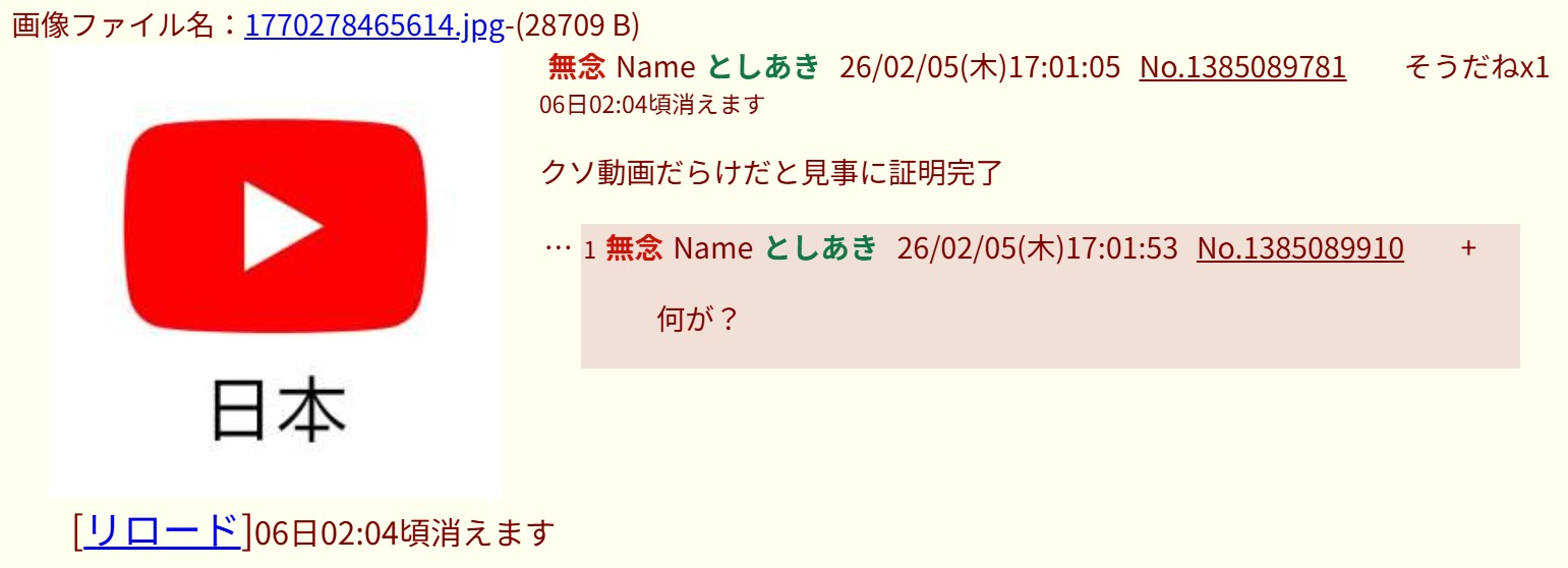 | … | 89無念Nameとしあき26/02/05(木)17:09:50No.1385091224そうだねx1>1770278597530.png |