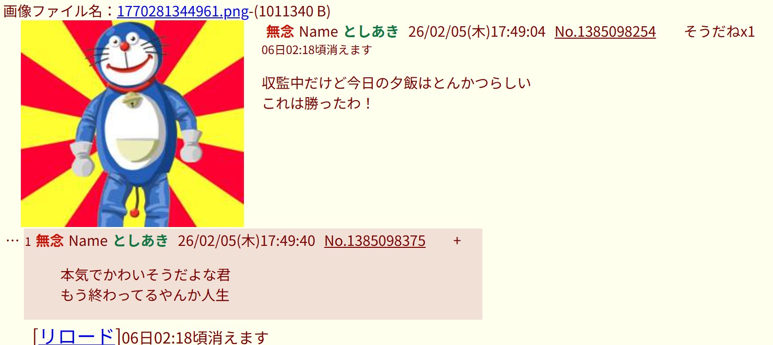 | … | 75無念Nameとしあき26/02/05(木)16:54:45No.1385088819そうだねx2>毎日毎日なんかドラえもんが変顔してる画像で誇大妄想丸出しのスレ立ててるけど |