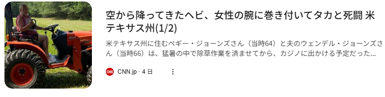 | … | 14無念Nameとしあき26/02/06(金)15:26:20No.1385294546+ 1770359180060.png-(109751 B) 空から降ってきて女性の腕に巻き付いてタカと死闘を繰り広げたヘビスレ |