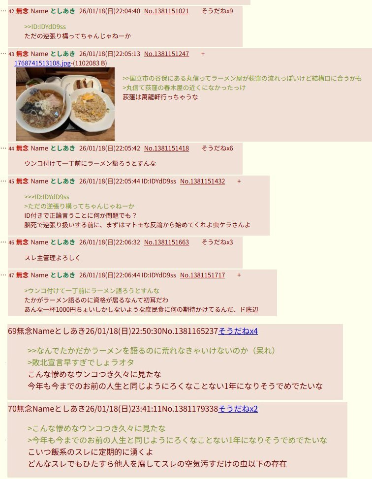 | … | 31無念Nameとしあき26/02/06(金)15:59:01No.1385299332+通りすがりのレストラントの店長も店員もアルバイトもアルバイト見習い補佐代理の松植くんも利用客もとしかきじゃないからアク禁になったところでどうということはないんやな |