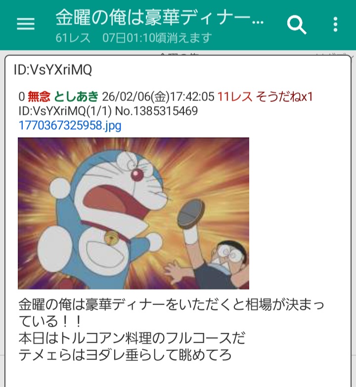 | … | 8無念Nameとしあき26/02/06(金)17:43:53No.1385315833そうだねx7 1770367433097.jpg-(2579473 B) >金曜の俺は豪華ディナーをいただくと相場が決まっている!! |