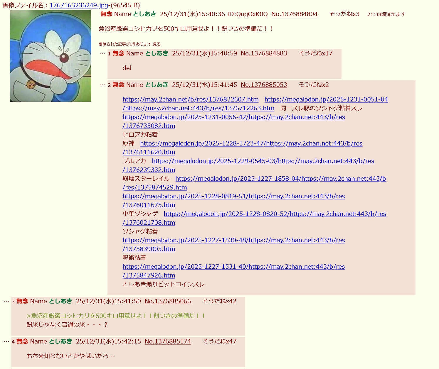 | … | 15無念Nameとしあき26/02/06(金)18:42:49No.1385328153そうだねx1 1770370969972.png-(343103 B) 「コシヒカリで餅つき」するアホの立てたスレ |