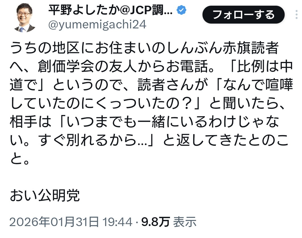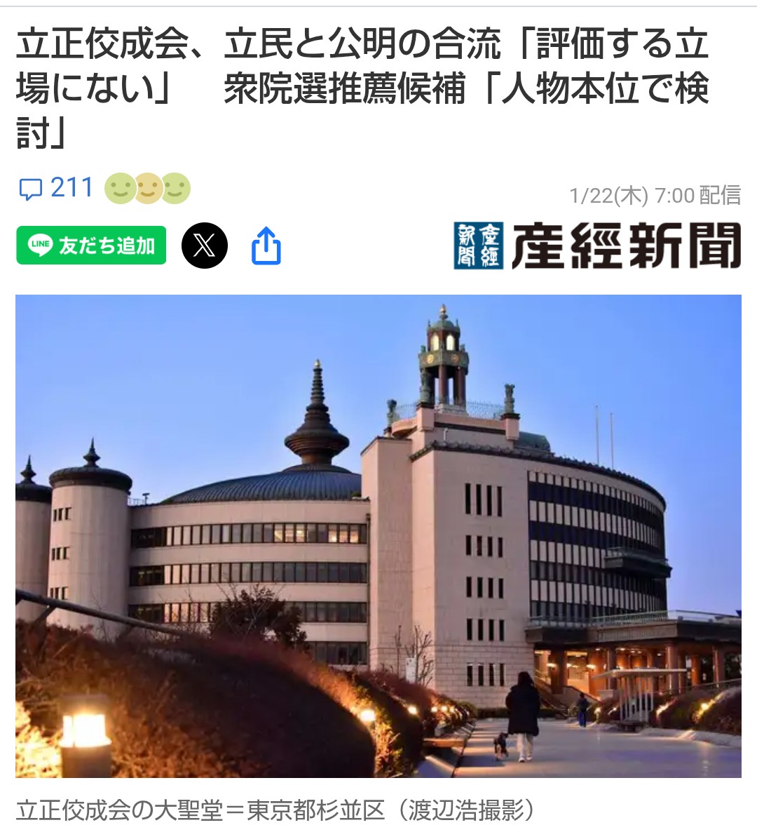 | … | 972無念Nameとしあき26/02/06(金)21:34:15No.1385375652そうだねx2公明は一見上手くやったように見えるけど次無いからなあれ |