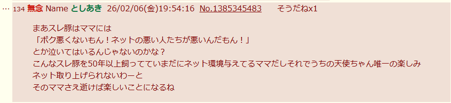 | … | 36無念Nameとしあき26/02/06(金)22:01:32No.1385383921+>妄想の世界に生きていらっしゃる |