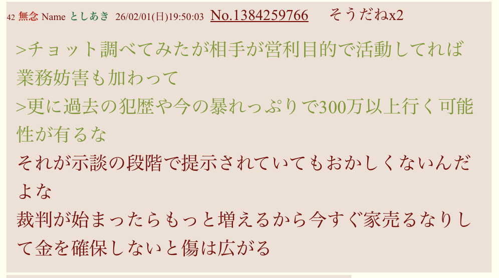 | … | 38無念Nameとしあき26/02/06(金)22:05:18No.1385385038そうだねx2そもそもマロさんが拠り所としてる300万円という数字は社長が言い出した事なんだ |