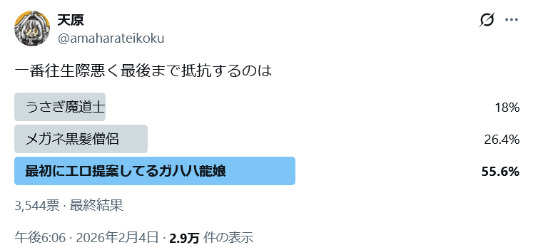 | … | 258無念Nameとしあき26/02/07(土)01:37:30No.1385430964+>天原スレに女子あきがいたとは |