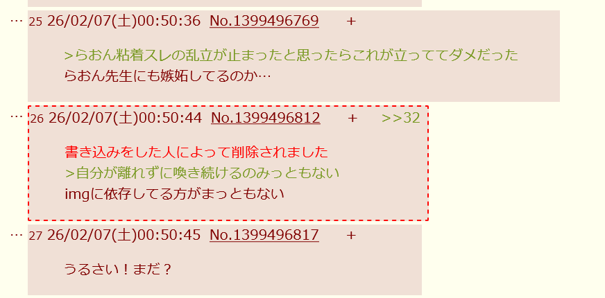 | … | 37無念Nameとしあき26/02/07(土)01:39:26No.1385431205+書き込みをした人によって削除されました |
