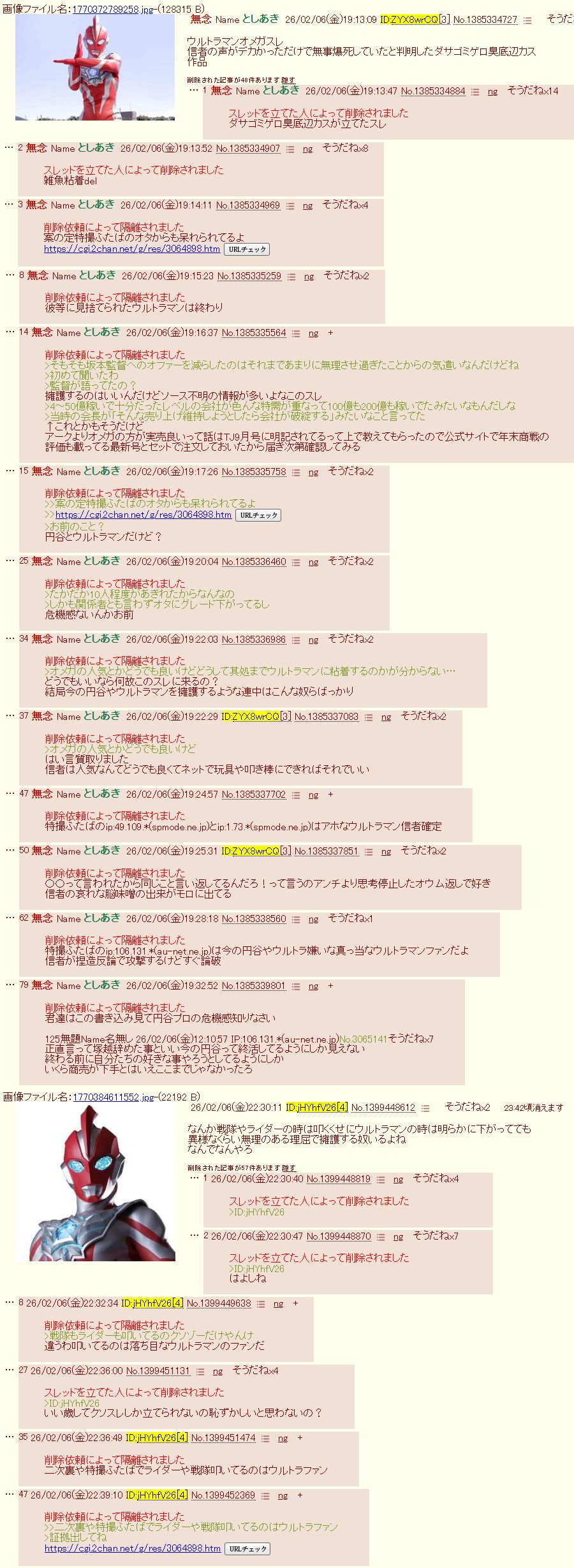 | … | 113無念Nameとしあき26/02/07(土)02:17:09No.1385434991そうだねx7IP丸出しで誹謗中傷してる特撮板の魚拓も送られてるみたいだしこのスレの魚拓も円谷送っておくね |
