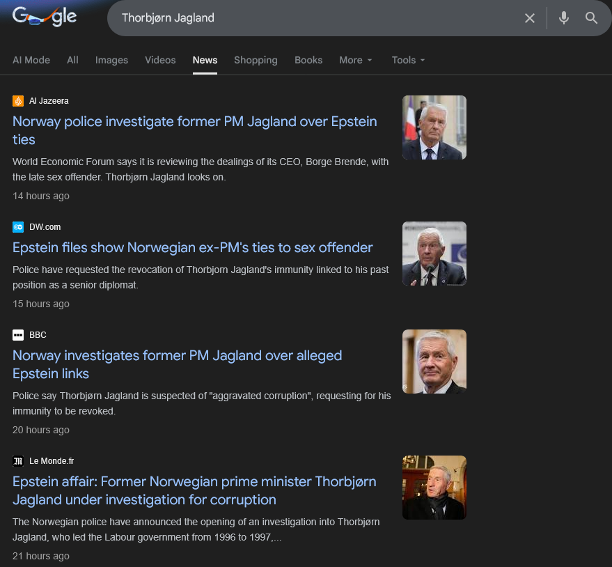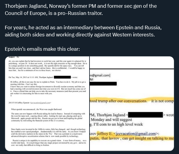 | … | 19無念Nameとしあき26/02/07(土)04:56:54No.1385442198+ 1770407814266.jpg-(212139 B) ノルウェーの元首相・欧州評議会委員長・ノーベル平和賞委員会委員長だったヤーグラン氏がエプスタインからの利益供与の疑いで、ノルウェーの経済犯罪警察から捜査を受けることになった。同時にヤーグラン氏の外交特権は廃止された。 |