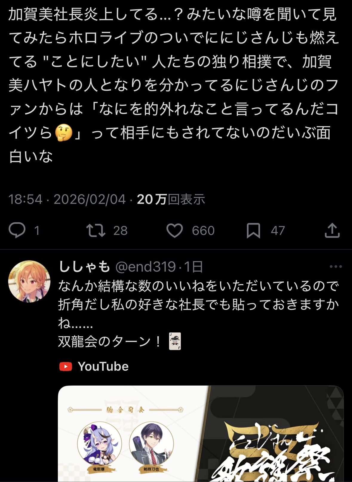 | … | 375無念Nameとしあき26/02/07(土)18:54:17No.1385585265+>ホロリスからしてもにじの社長とか言われても誰?としかならんやろ… |