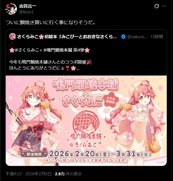 | … | 284無念Nameとしあき26/02/07(土)18:10:35No.1385574333+鯛焼きコラボはもう4回目になる信頼と実績あるものだから無くなりはせんわ |