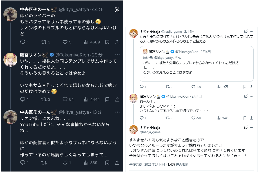 | … | 326無念Nameとしあき26/02/07(土)18:22:21No.1385577169そうだねx6 1770456141898.png-(335363 B) そういやリオンの切り抜き作ってる人がケチ付けられて控える話もあった |