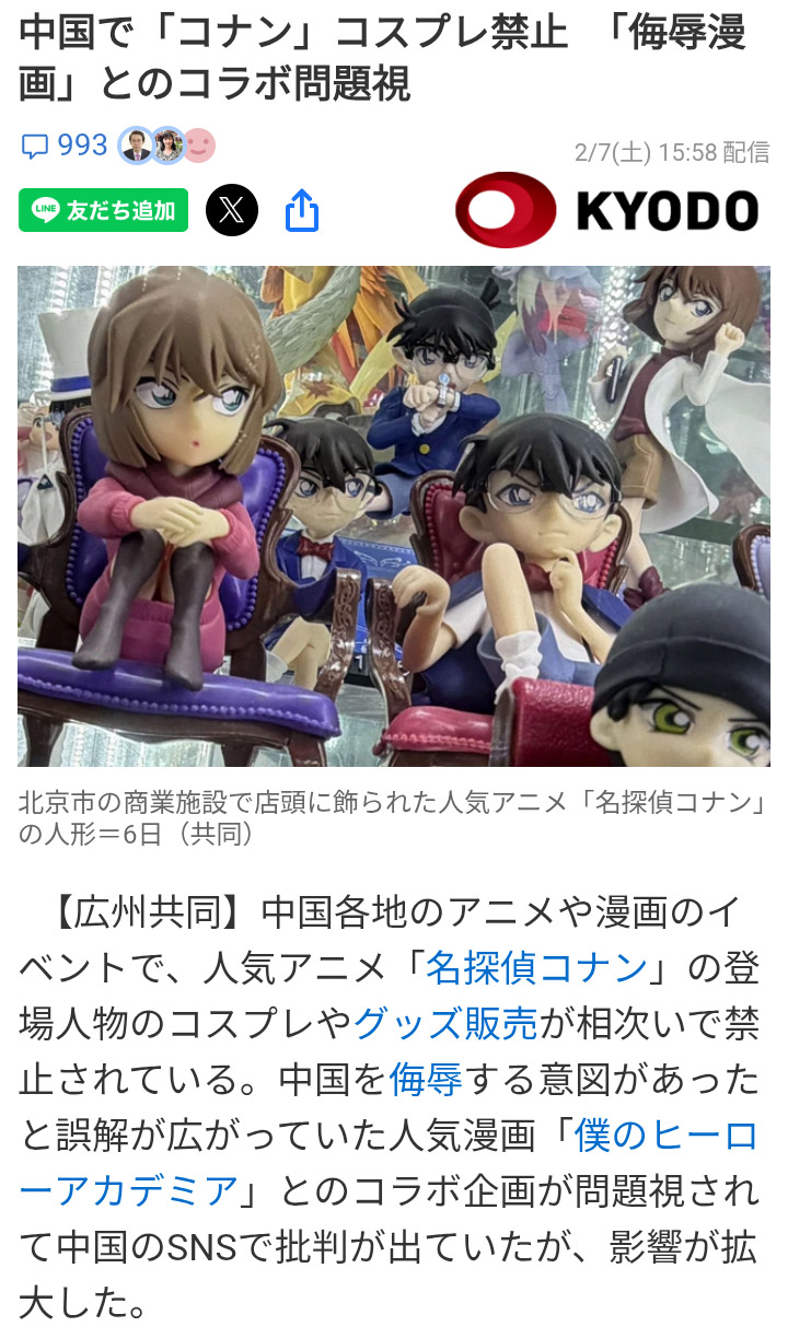 「僕の―」を巡っては2020年、登場人物の名前が日中戦争中に細菌兵器を開発した旧日本軍の関東軍防疫給水部(731部隊)を想起させるとして中国で批判が起きた。原作者が互いの作品の主人公を書き下ろしたイラストを公開するなど両作品がコラボを展開したところ、今年に入ってコナンに対しても「侮辱だ」と批判が広がった。