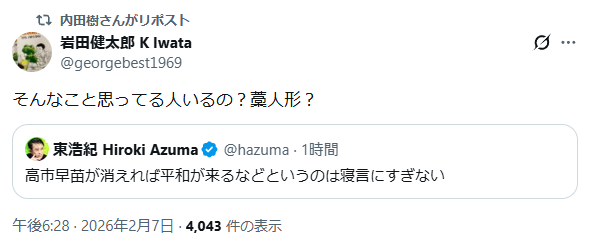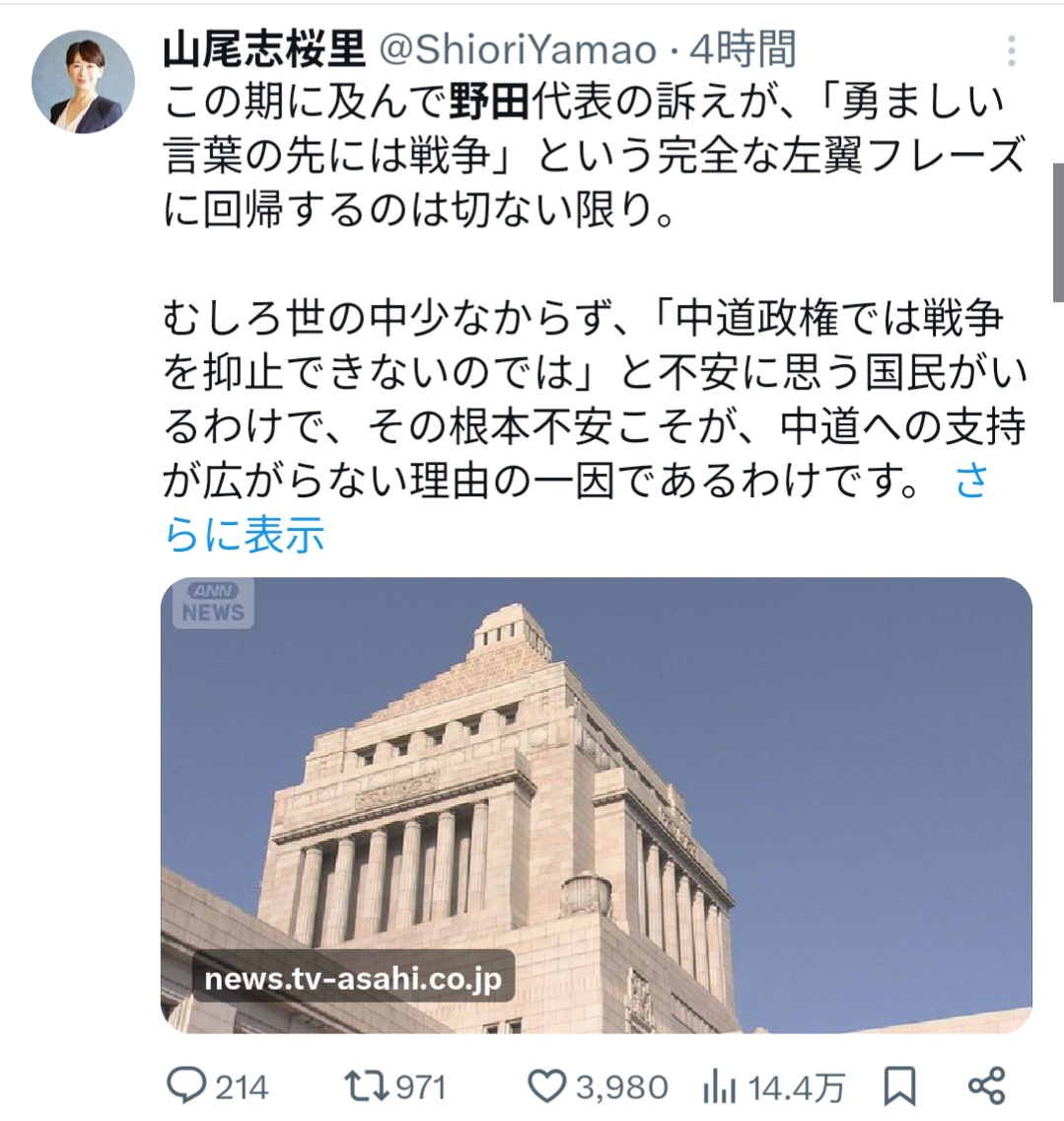| … | 73無念Nameとしあき26/02/07(土)18:13:04No.1385574904+中道ではなく芯がないだけなんでは… |