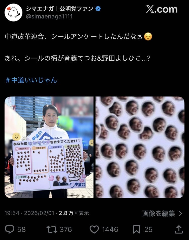 | … | 29無念Nameとしあき26/02/07(土)17:49:28No.1385569472+「ちゅうどう改革連合」表記の方が今風でまだウケは良かった筈 |