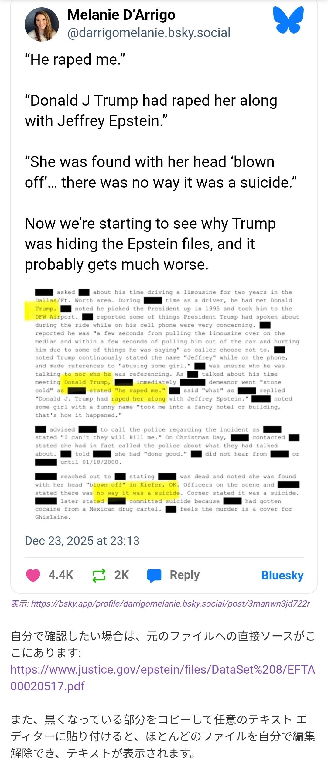 | … | 197無念Nameとしあき26/02/08(日)01:40:04No.1385691873+>100%自殺で疑い無しだってFBI長官(トランプ派でMAGAの陰謀論者)も言ってるが |