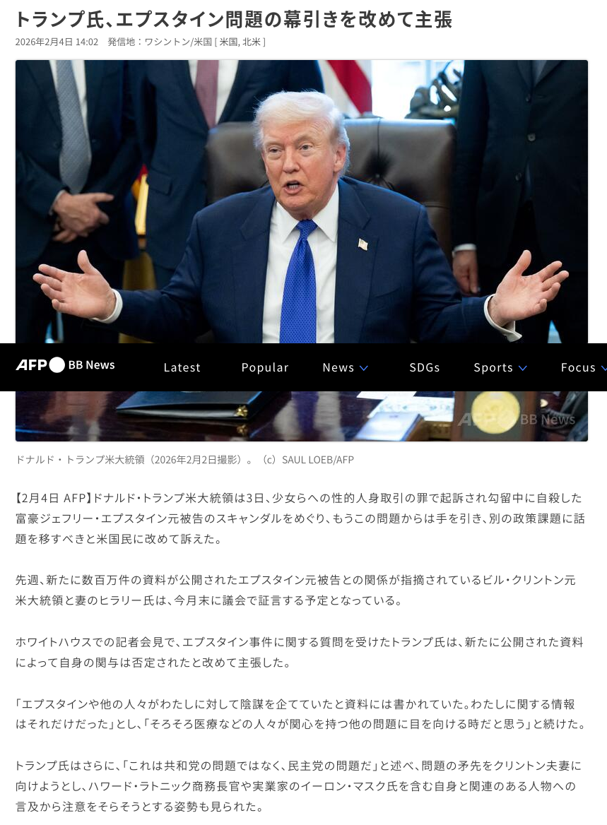 | … | 242無念Nameとしあき26/02/08(日)03:19:07No.1385700664+トランプが幕引きにしたいのは自分がヤバい訳ではなく |