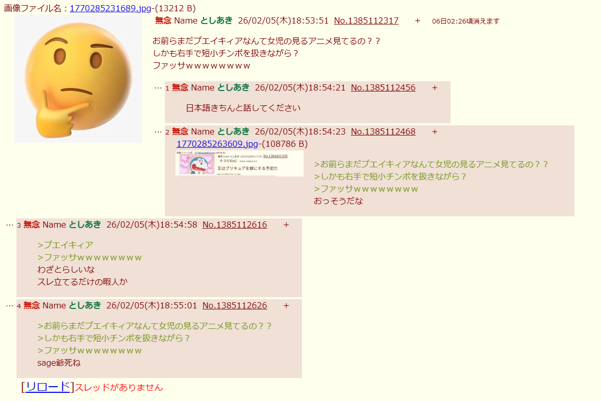| … | 144無念Nameとしあき26/02/08(日)13:33:22No.1385790959+>何なら荒らしが台頭してきたのはマジでここ2〜3年だよな侵略者はむしろスレ豚あたりなのよ |