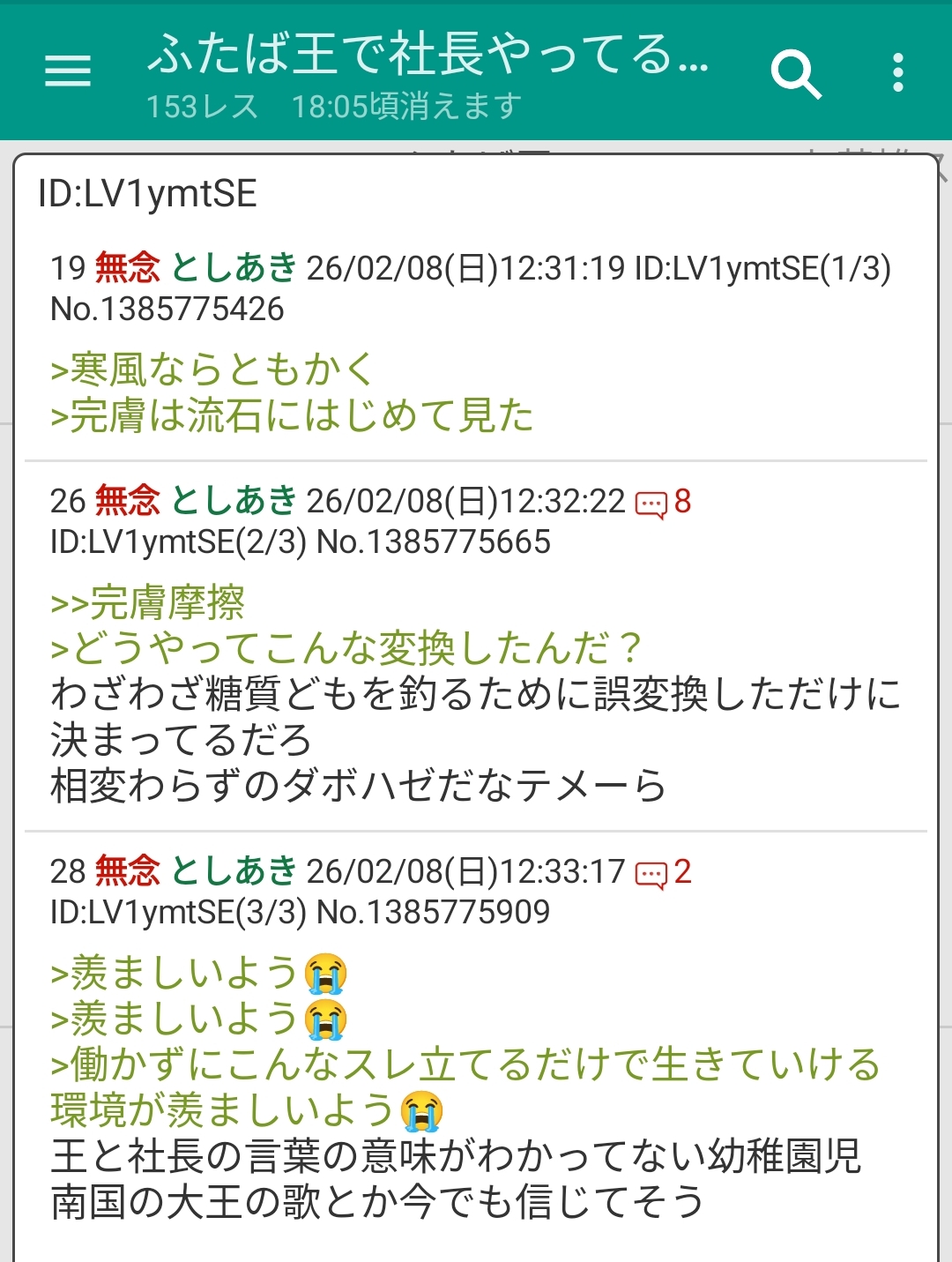 | … | 75無念Nameとしあき26/02/08(日)12:48:33No.1385779765そうだねx1>ふたば王で社長やってる |