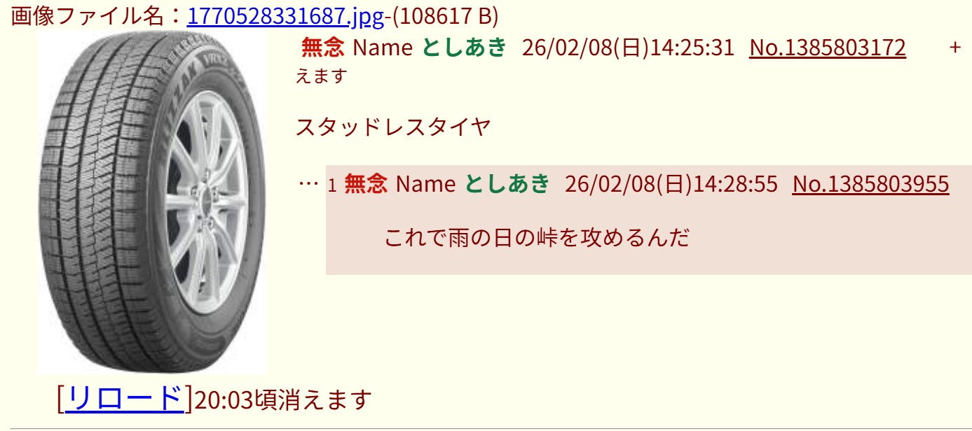 | … | 19無念Nameとしあき26/02/08(日)14:58:56No.1385810730+>ID:6Yu2Fpwk |