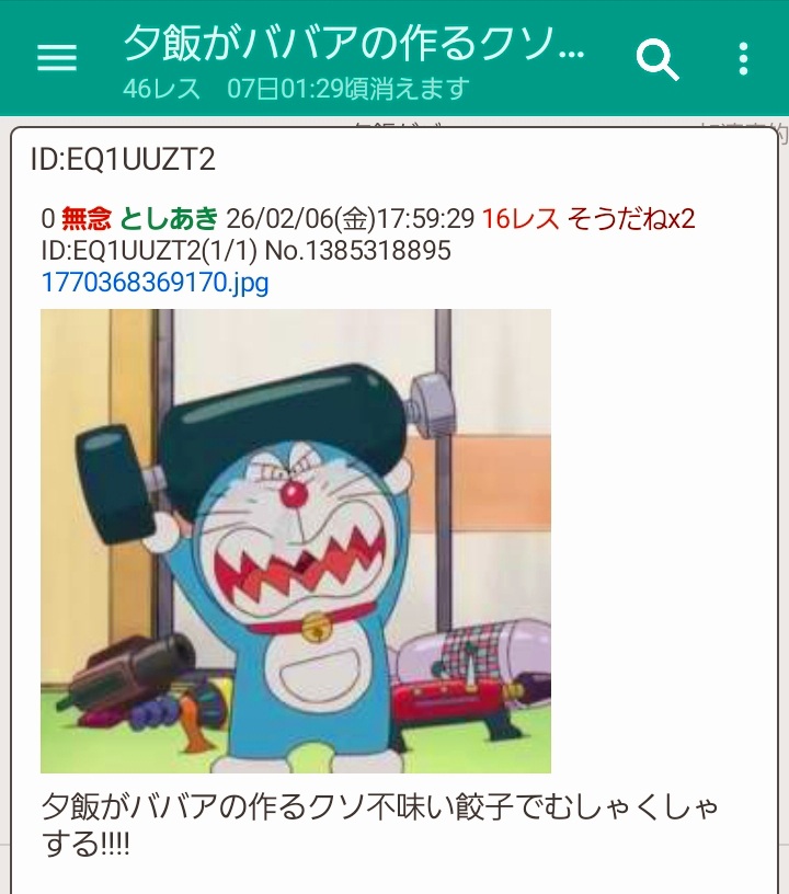 | … | 15無念Nameとしあき26/02/08(日)20:32:05No.1385905615そうだねx9>>たまにはママの作った晩飯でも貼れよ盛大に笑ってやるからw |