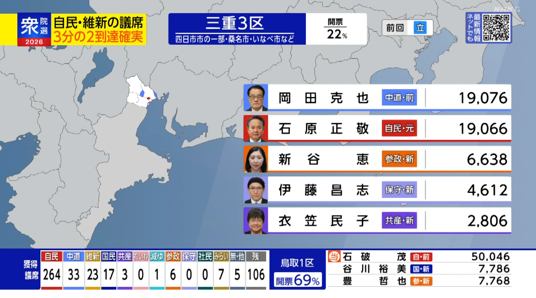 | … | 990無念Nameとしあき26/02/08(日)23:15:08No.1385987655そうだねx3選挙区やっと一人当確でたな |