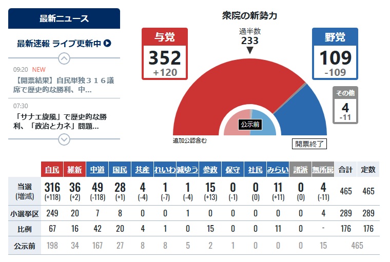| … | 41無念Nameとしあき26/02/09(月)10:02:25No.1386081884+うちの選挙区いつも立憲が強かったんだけど今回は自民が勝って驚いたわ…しかも結構差がついてた |